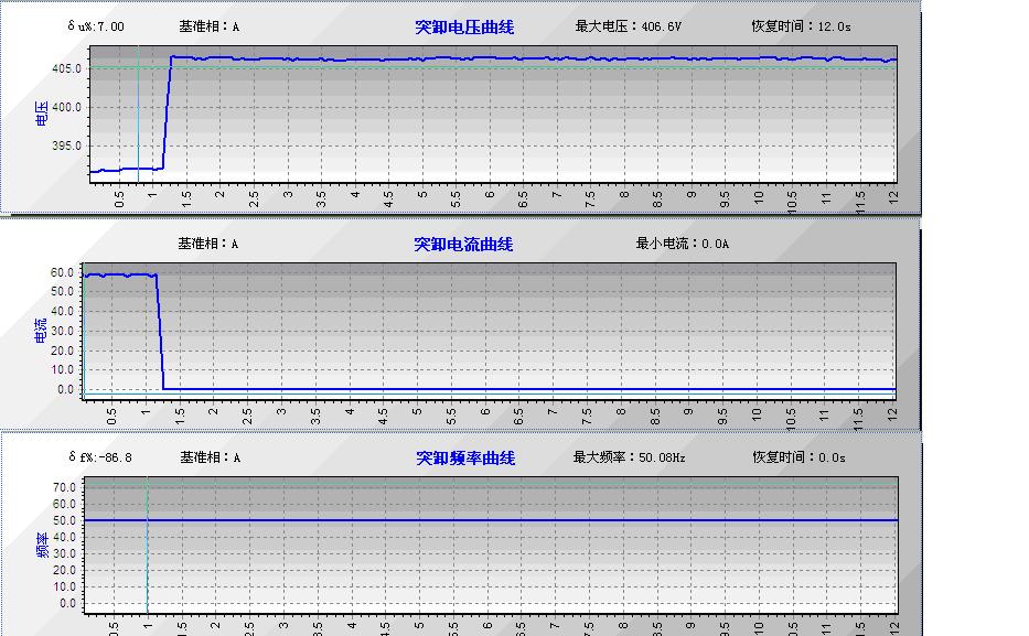 1)實時電壓、電流、頻率、功率曲線;2)電壓曲線圖;